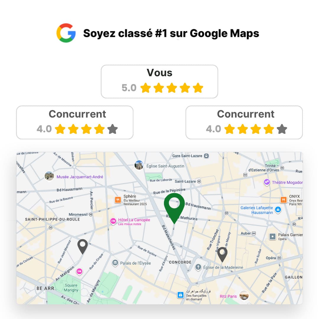 Chaque avis positif devient un moteur concret pour augmenter votre trafic, vos contacts et vos ventes.